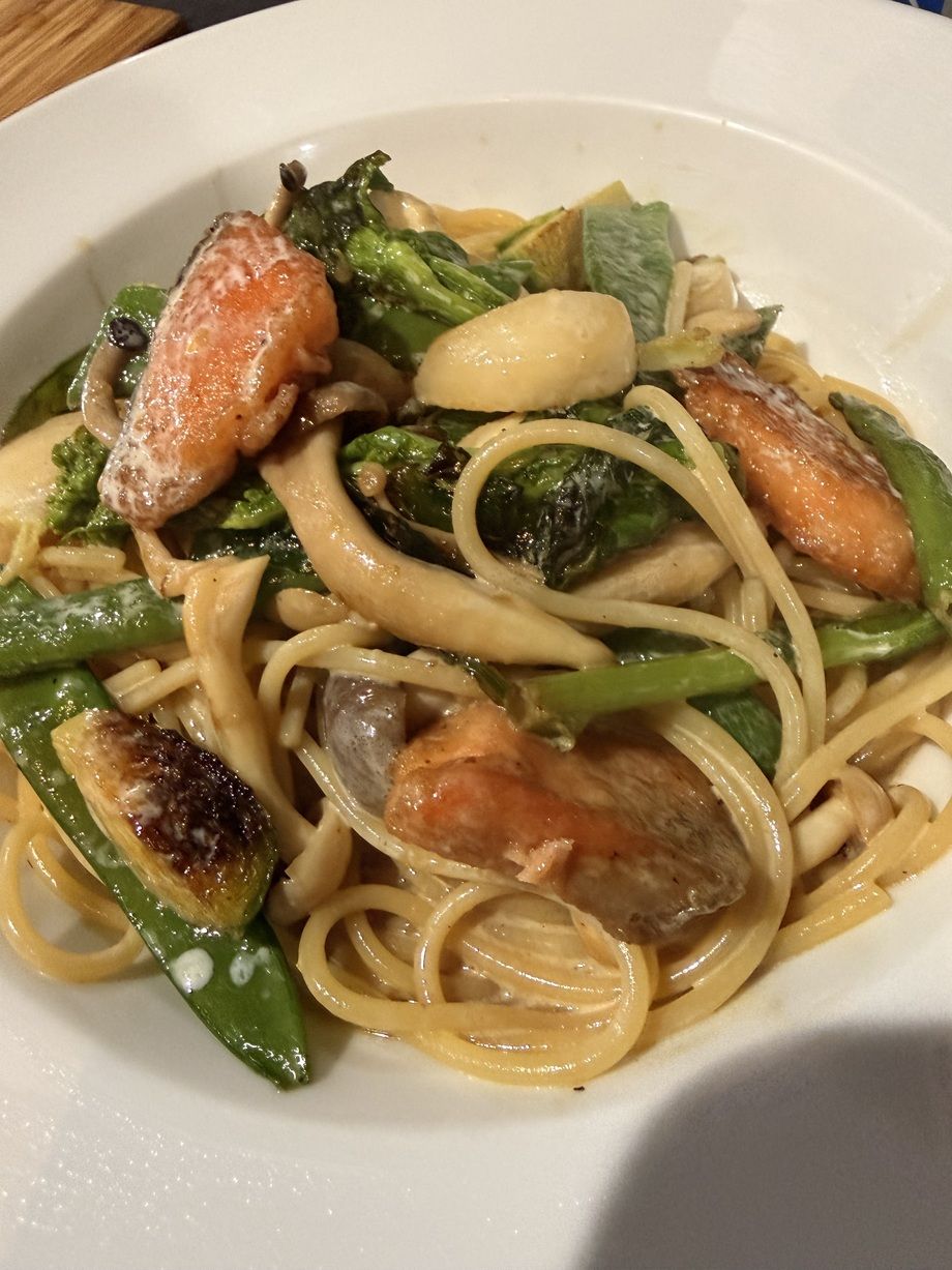 ごちそうパスタ 塩鮭と春野菜の醤油生クリーム(数量限定です、品切れ又は、予告なく変わる場合があります)