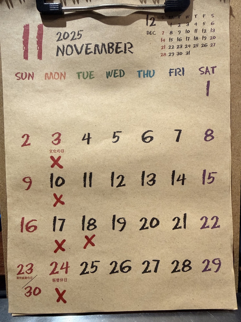 おはようございます✨ オルソでございます🐻 11月のお休みです。 毎週月曜日定休日 18日火曜日お休み ご予約のお問い合わせが増えております 大変ありがとうございます✨ ですがランチタイムは予約は出来ませんので 空席状況はお電話でご確認ください。 ディナータイムはご予約可能ですので お気軽にお電話ください✨