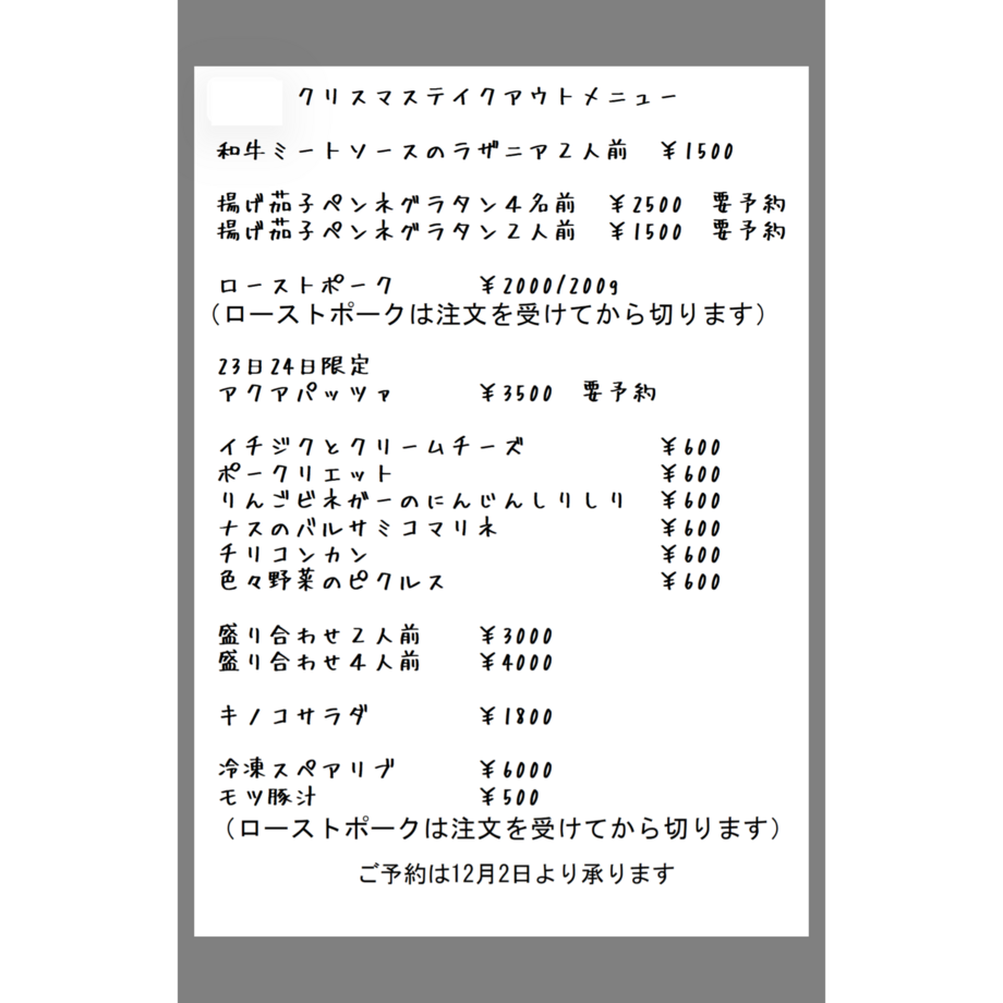 クリスマステイクアウト12月20日(土)から25日(木)まで